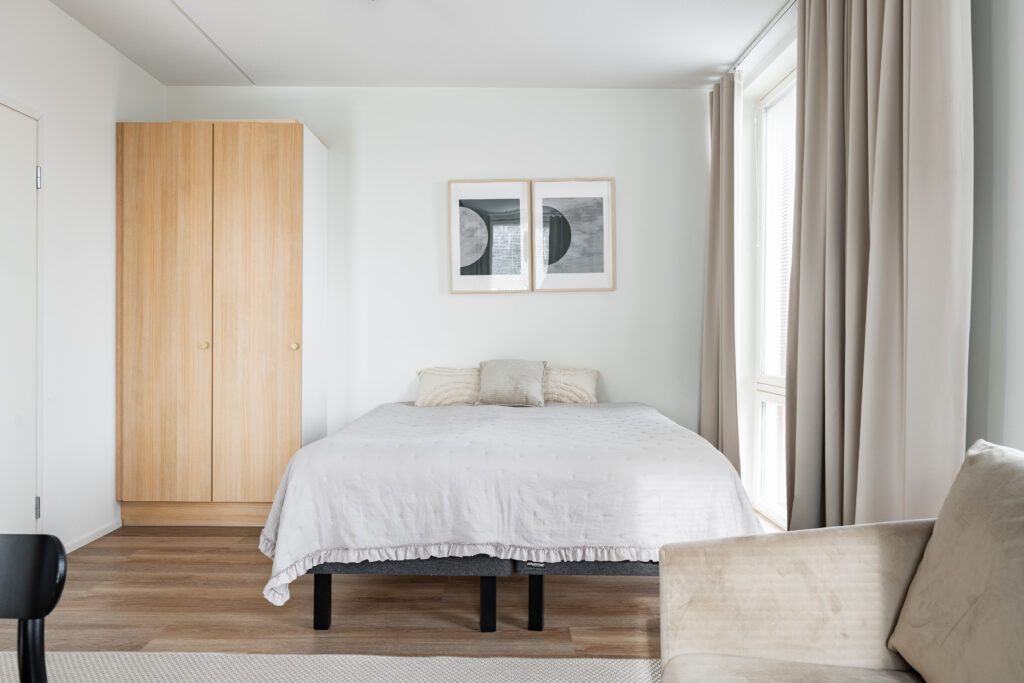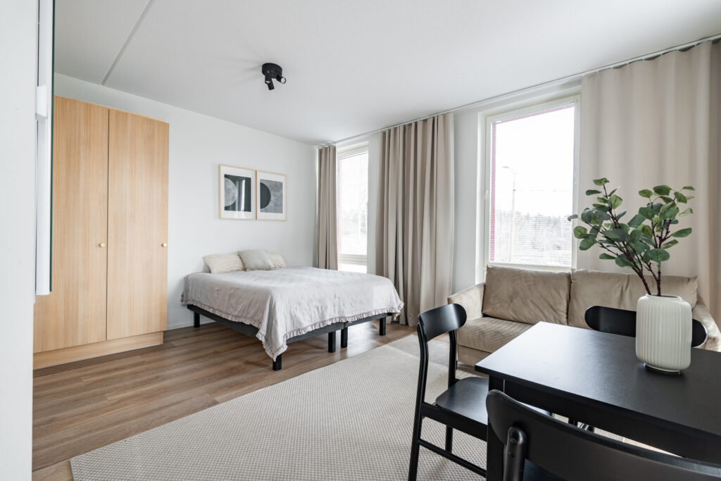 Tarjoamme tavallisten large -huoneistojen lisäksi esteetöntä asuntoa etsivälle 32m2 large huoneistoja, joissa on tilaa kääntyä pyörätuolilla tai rollaattorilla liikkuessa. Talossa on hissi ja studion sisällä ei ole kynnyksiä, jotka rajoittaisivat liikkumista.