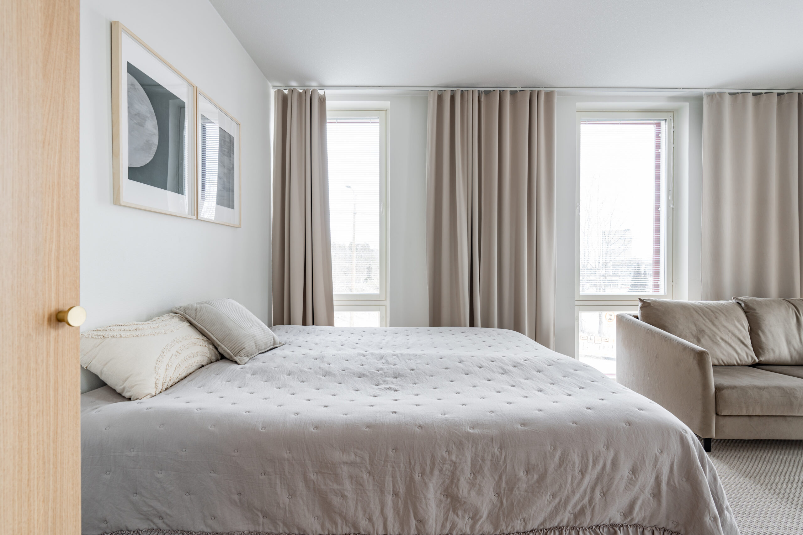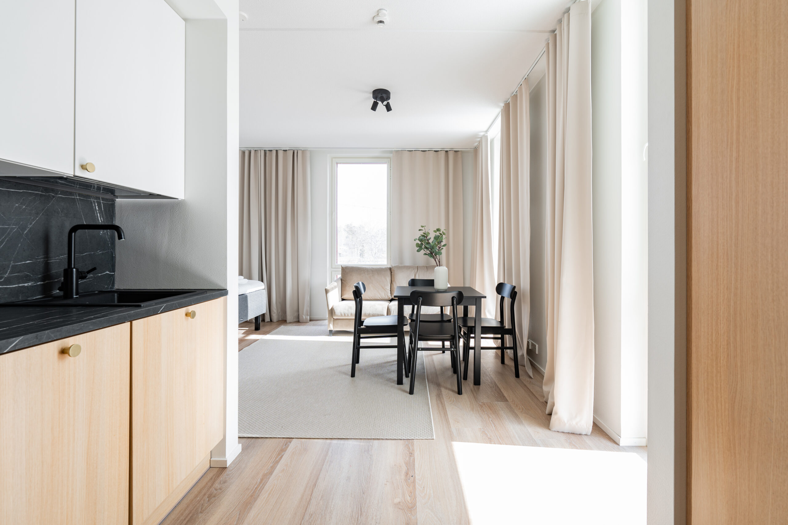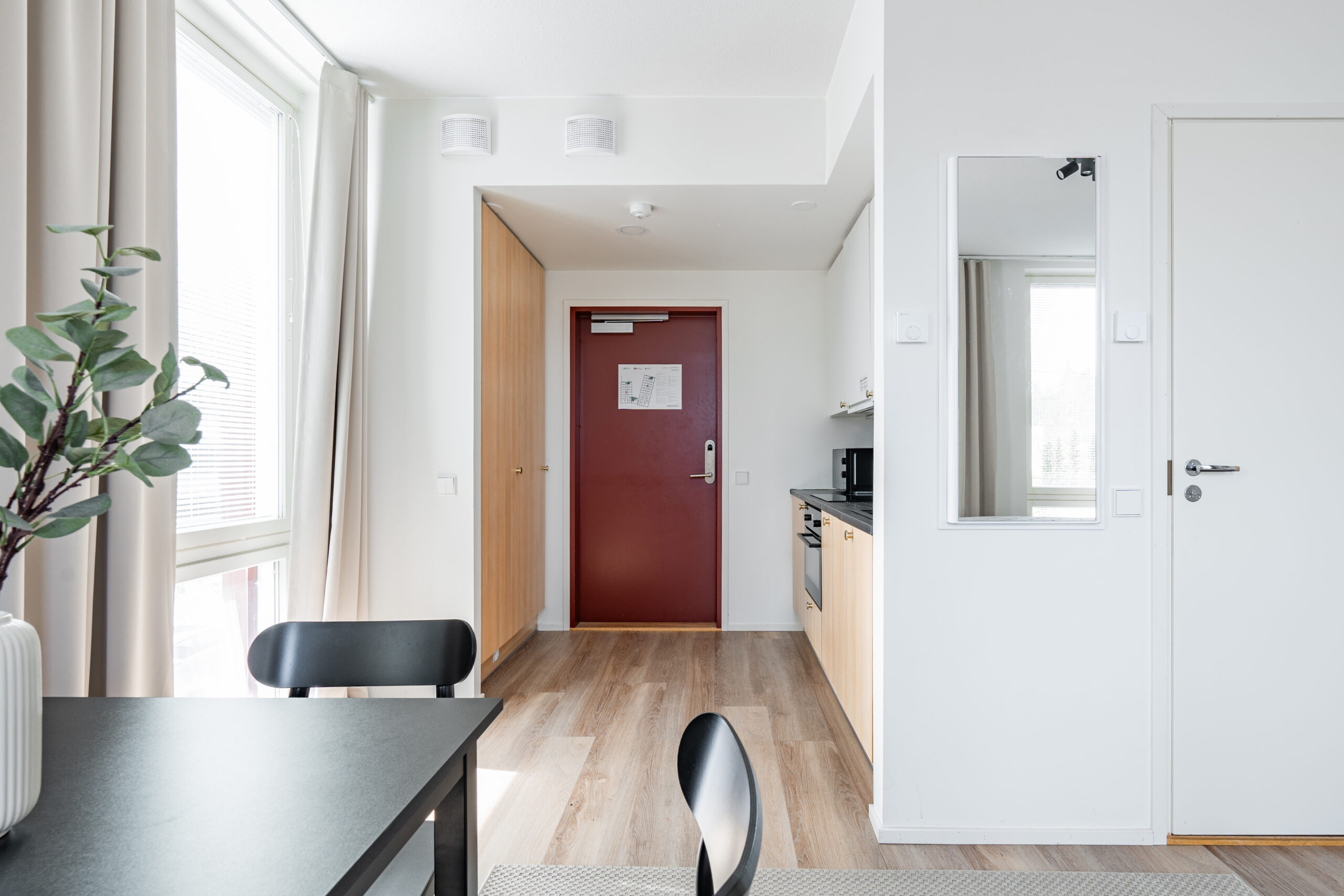 Tarjoamme tavallisten large -huoneistojen lisäksi esteetöntä asuntoa etsivälle 32m2 large huoneistoja, joissa on tilaa kääntyä pyörätuolilla tai rollaattorilla liikkuessa. Talossa on hissi ja studion sisällä ei ole kynnyksiä, jotka rajoittaisivat liikkumista.