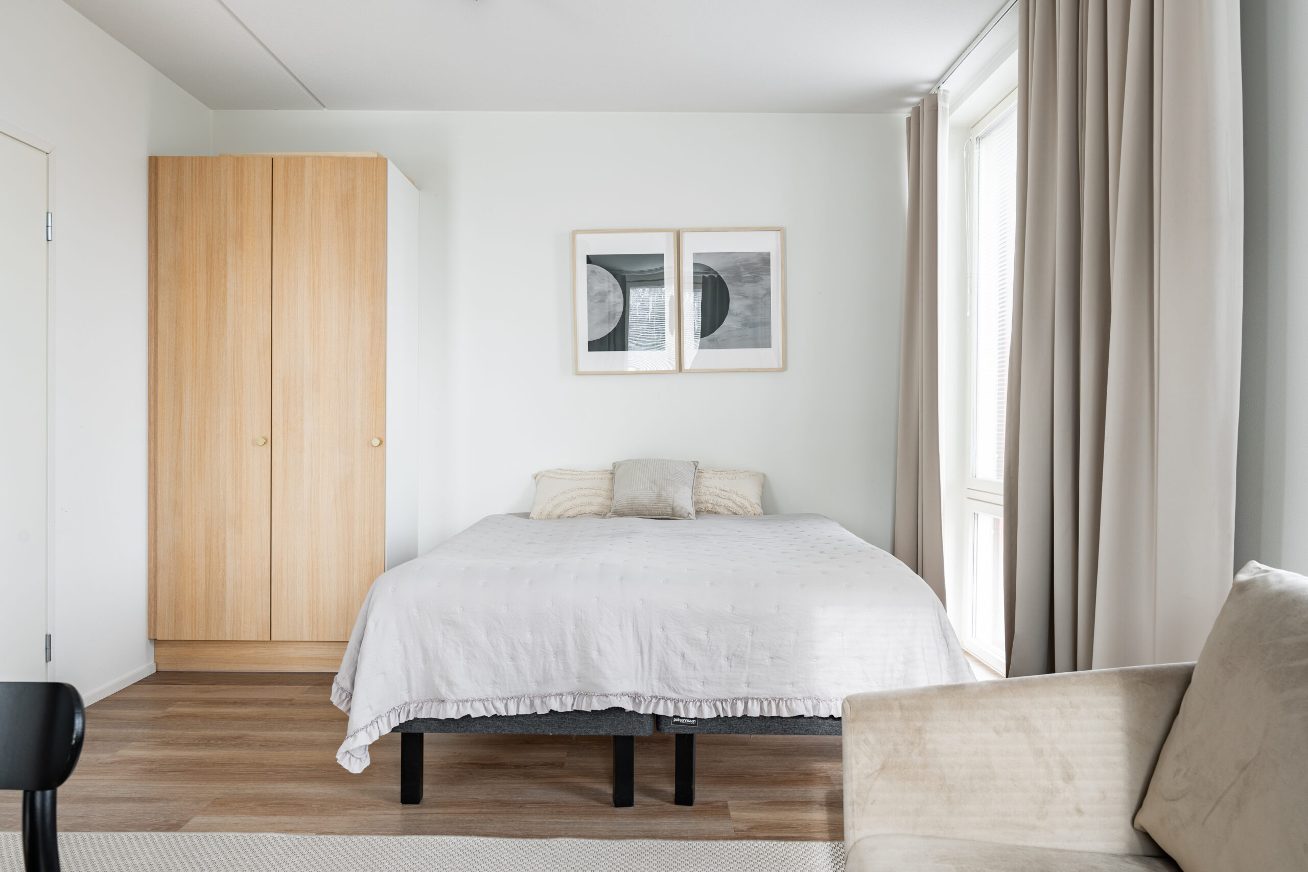Eloisa, kevyesti kalustettu studio, asuntomestari ja yhteiset tilat. Voit asua meillä 1-6 kuukautta.